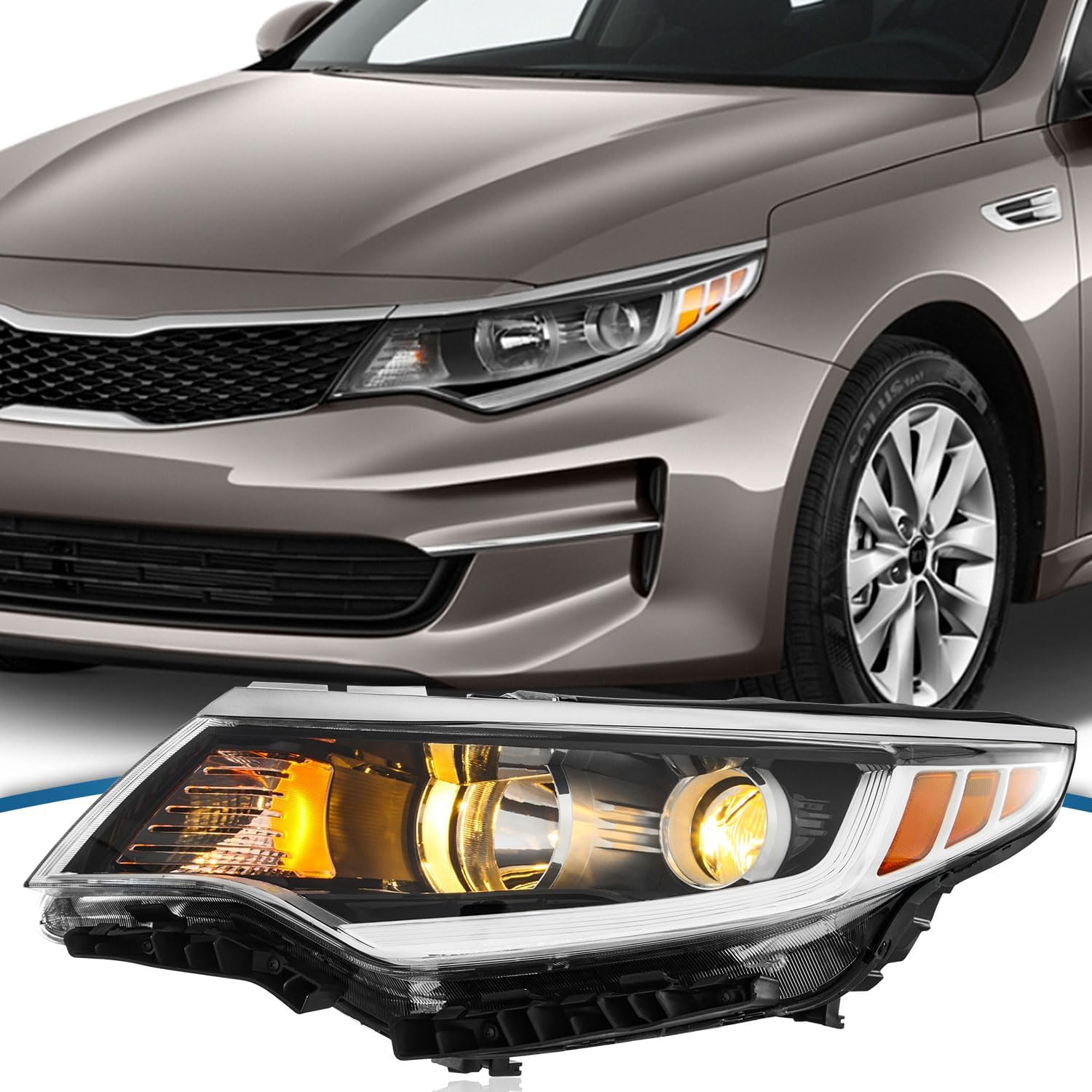 Suitable models: Replacement for 2016 Kia Optima Replacement for 2017 Kia Optima Replacement for 2018 Kia Optima Light Source:Halogen type,without daytime running lamp. Bulb Model:High Beam:HB3,Low Beam:H7,Turn Signal Lamp:PY21W,Side maker lamp:T10.