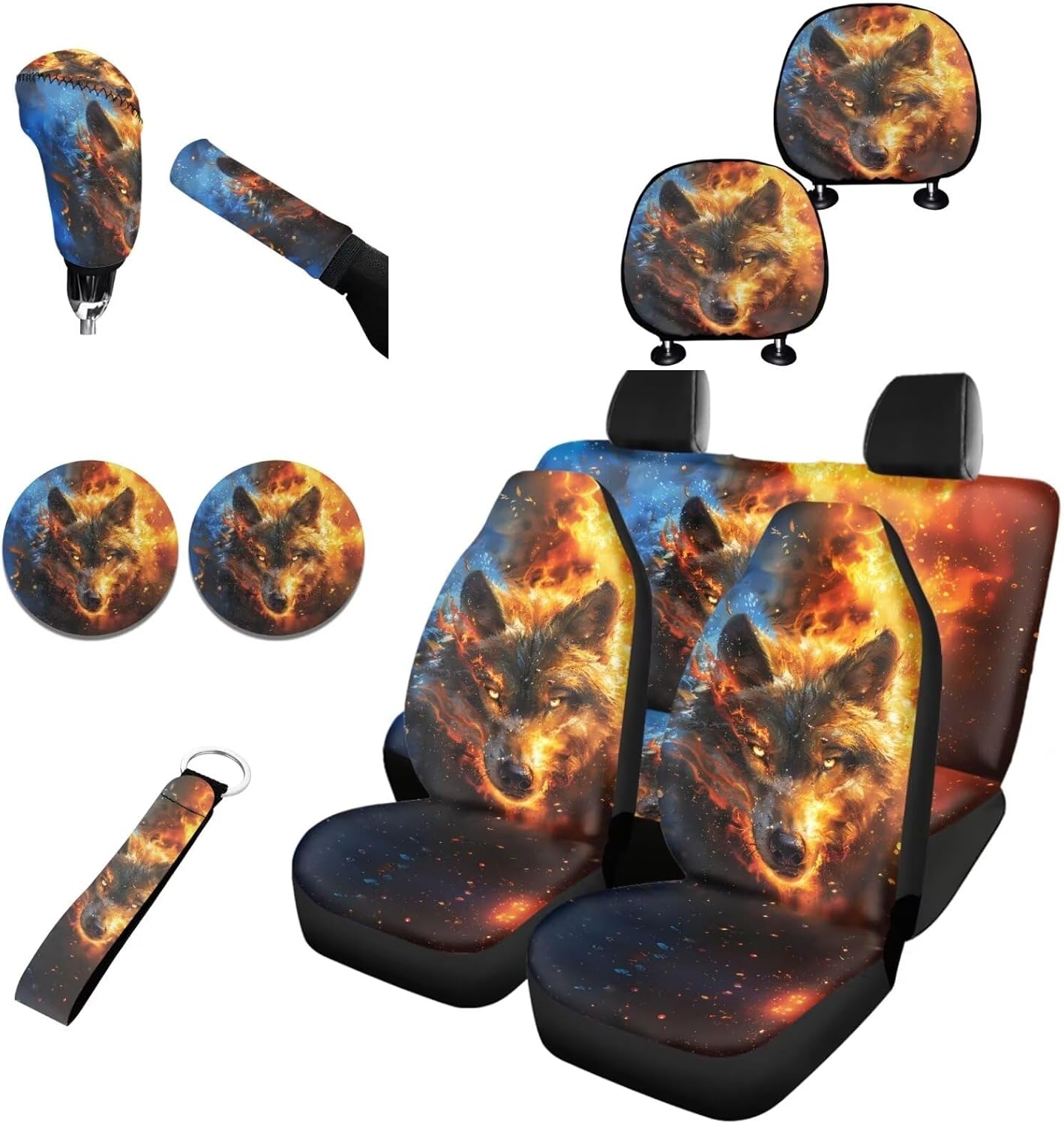 Package:All 10PCS,Includes 2Pcs Front Bucket Seat Covers+Rear Bench Cover+2Pieces Cup Coaster+Auto Keychain Holder+Gear Shift Cover+Handbrake Cover;These car seat covers is design to protect our car seat, bring more comfortable to our drivers. Suitable for almost universal automobile cars. Quick and easy installation,no ools required for installation. Pay attention to the Warining that these car seat covers should NOT be used on a seat with side airbags. Back Polyester fabric material, easy to clean and dry. washable ,no fading. Soft material keep hip and back comfortable in long time use. Keep your car seats from wear and stains. Elastic strap with hooks on the bottom of the seat covers, easy to install and remove. Universal-fit car seat covers will stretch to fit most car and SUV bucket style seats. Before buying please check whether your car seat is compatible.